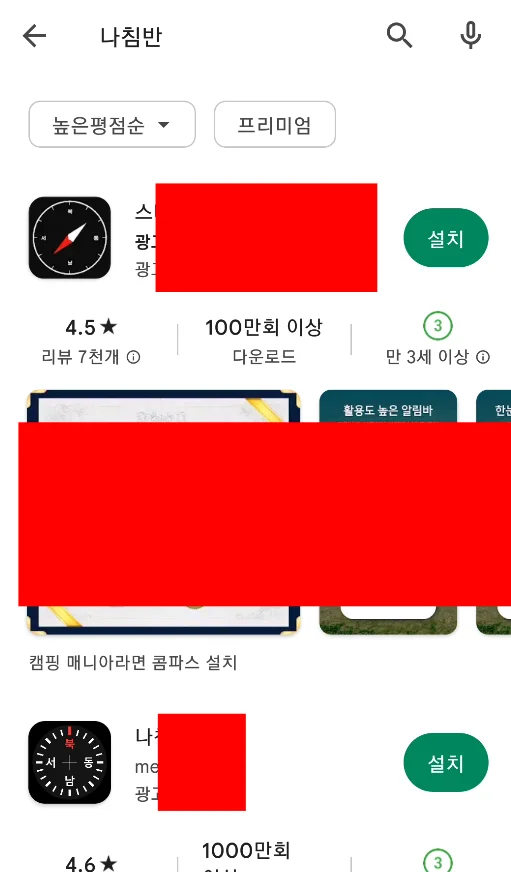 위 사진은 구글 플레이 스토어에서 나침반을 검색한 결과입니다. 아래로 화면을 넘겨보면서 마음에 드는 앱을 선택하여 '설치'를 진행하시면 도움이 될 수 있습니다.