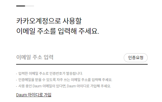 인증에 이용할 이메일 주소를 입력합니다. 입력 후, '인증요청'을 통해 인증 번호를 확인할 수 있습니다. 그 이후에는 비밀번호 설정과 같은 과정이 남습니다. 안내에 따라 진행하시면 카카오 계정 만들기를 할 수 있습니다.