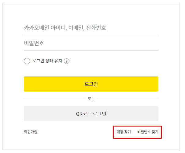 위 사진은 카카오 로그인 페이지 입니다. 붉게 표시된 부분을 확인하시면 계정 찾기 / 비밀번호 찾기 기능을 확인할 수 있습니다. 원하는 기능을 활용하시면 도움이 될 수 있습니다.