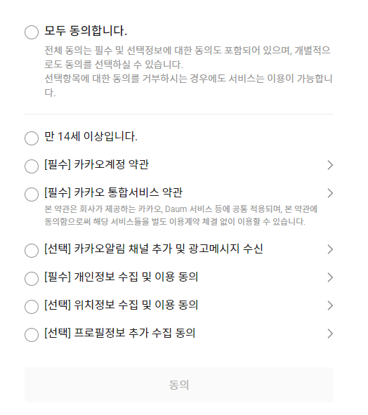 서비스 이용에 관련한 동의 안내 페이지 입니다. 필수 사항은 반드시 체크를 하셔야 진행할 수 있습니다.