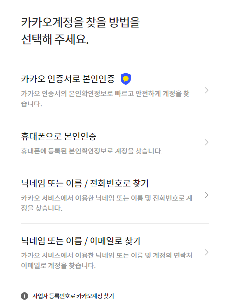 카카오 계정 찾기 기능을 활용하기 위해서는 인증 과정을 거쳐야 합니다. 위 사진은 인증으로 사용할 수 있는 방법을 참고할 수 있는 예시 사진입니다. '인증서' , '휴대폰' , '닉네임' , '이메일' 등을 활용할 수 있습니다.