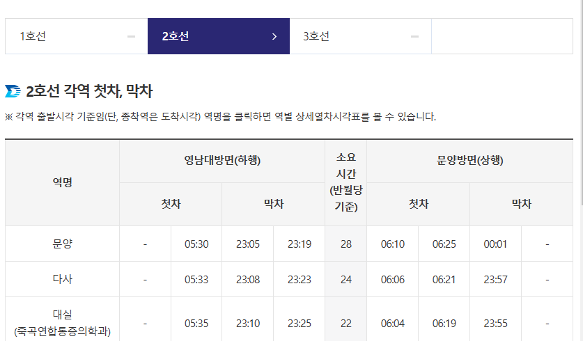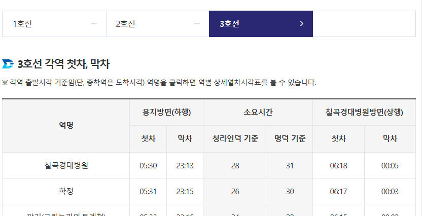 '열차 시각표'를 선택하면 나타는 홈페이지 화면입니다. 위 사진을 참고하세요. 1호선, 2호선, 3호선의 선택으로 각 역에 대한 첫차, 막차, 소요시간을 상행과 하행으로 구분하여 확인할 수 있습니다. 아래의 예시 사진을 참고해주세요.