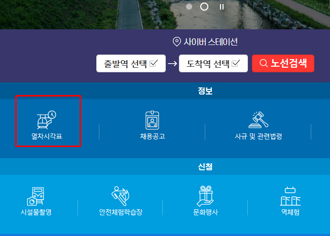 위 사진을 참고하여 지하철 시간표 페이지를 찾을 수 있습니다. '열차시각표'라고 적혀있는 메뉴를 선택합니다.