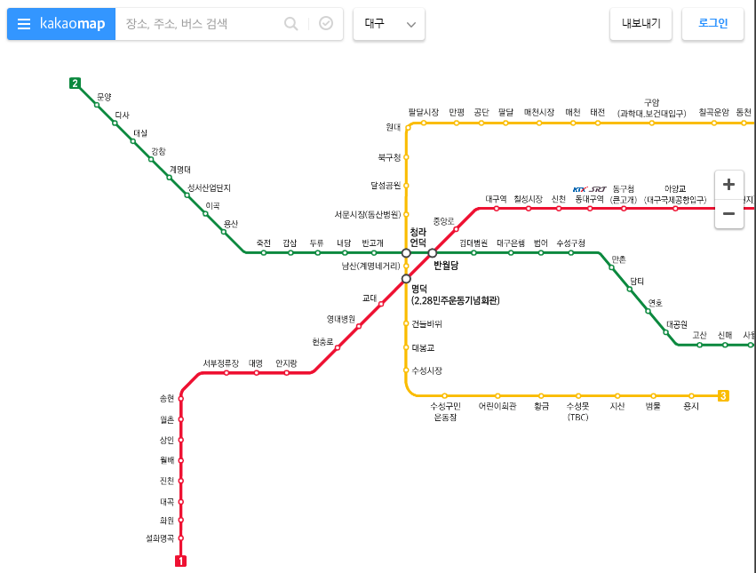 ▲ 위 사진은 지하철 노선 크게보기를 통해 확인할 수 있는 참고 예시 사진입니다. 카카오맵으로 연결되어 대구 지하철 노선을 크게 보여주고 있습니다.