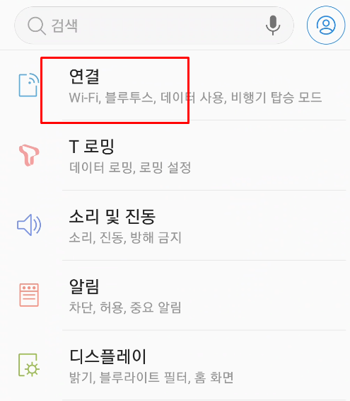 2. 설정 메뉴 중에서 '연결'을 선택합니다.