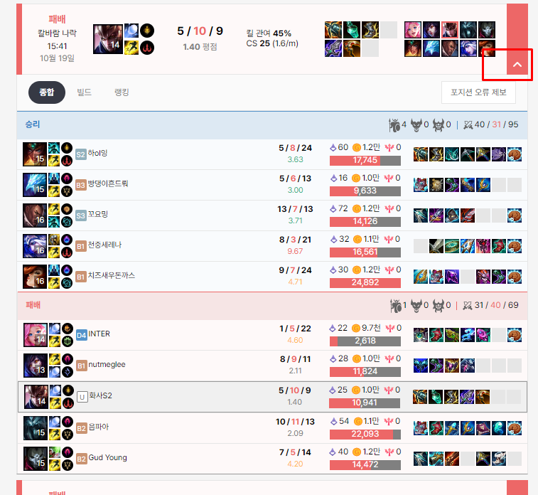 위 사진은 전적정보의 상세 정보를 보기 위해 화살표를 선택한 예시 사진입니다. 해당 게임에 참여한 모든 플레이어에 대한 정보를 확인할 수 있습니다.