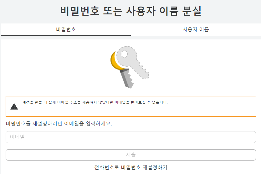 🔼 위 사진은 '비밀번호 또는 사용자 이름'을 찾을 수 있는 페이지의 예시 사진입니다. 해당 페이지에서 안내하는 내용에 따라 진행하면 비밀번호 재설정이 가능합니다. 단, 주의할 부분이 있습니다. 위 사진에서도 보이죠.