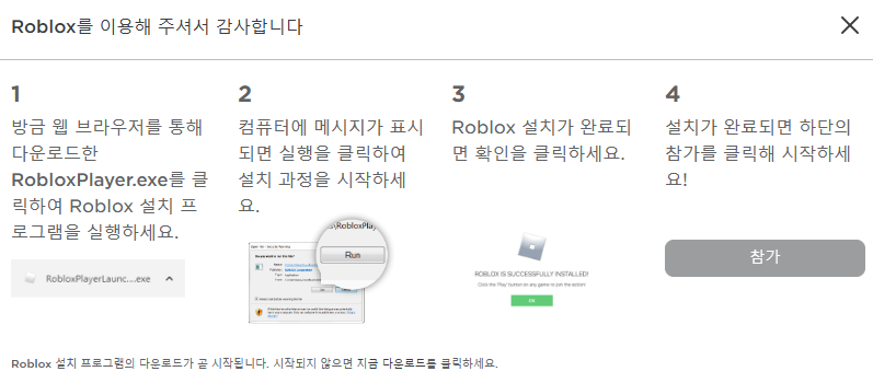 🔼 위 사진은 로블록스 다운로드를 선택하면 등장하는 안내 문구의 예시 사진입니다. 해당 내용들을 잘 살펴보신다면 도움이 될 수 있을 것 같네요. 특히 두번째 사진의 내용은 꼭 살펴보실 것을 추천합니다.