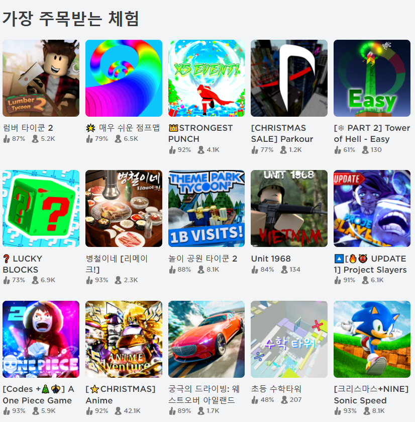 🔼 위 사진은 로블록스 플랫폼에서 확인할 수 있는 '가장 주목받는 체험' 카테고리에 등록된 게임들의 일부 예시 사진입니다. 위 사진에서 보여지는 것은 극히 일부이며, 상상을 초월할 정도로 많은 게임들이 등록되어 있습니다. 다 둘러보는대도 시간이 많이 걸릴 것 같습니다.