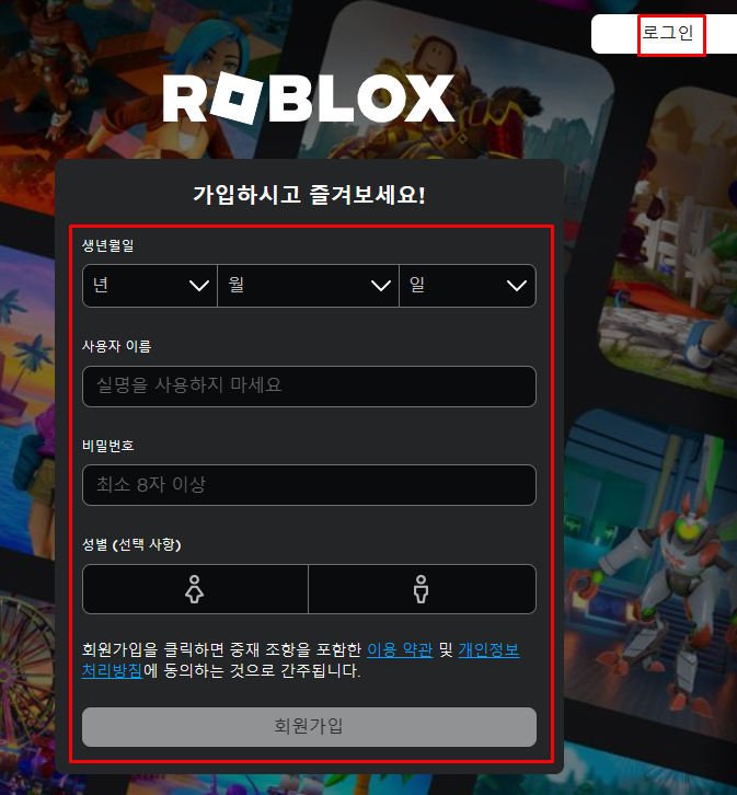 로블록스 홈페이지에 접속하면 깔끔하게 로그인 혹은 회원가입 페이지로 연결됩니다. 이미 회원가입을 했다면 로그인을 하면 되겠죠. 아직 아이디가 없다면 메인 화면에서 회원가입 절차를 진행합니다. 아래 사진은 회원가입 및 로그인 페이지의 참고 사진입니다.