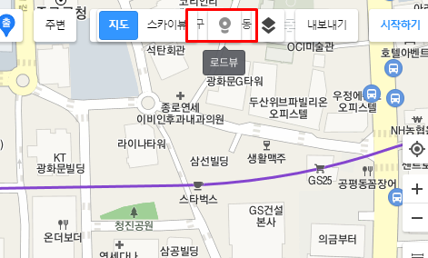 ▲ 위 사진은 로드뷰 기능 아이콘이 있는 위치를 참고하기 위한 예시 사진입니다. 지도 상단부분에서 찾을 수 있습니다.